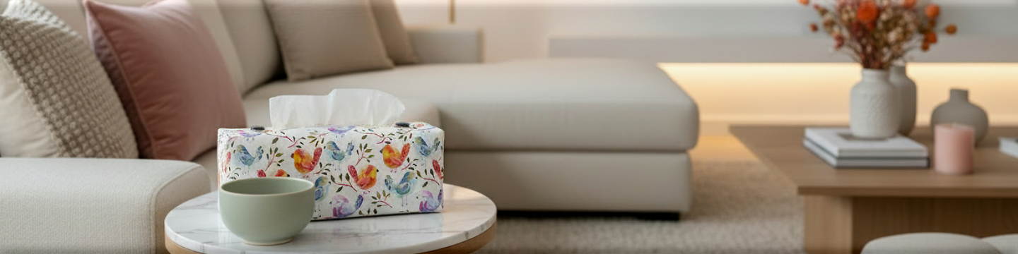 Expertly crafted tissue box covers, tote bags, coasters, and accessories