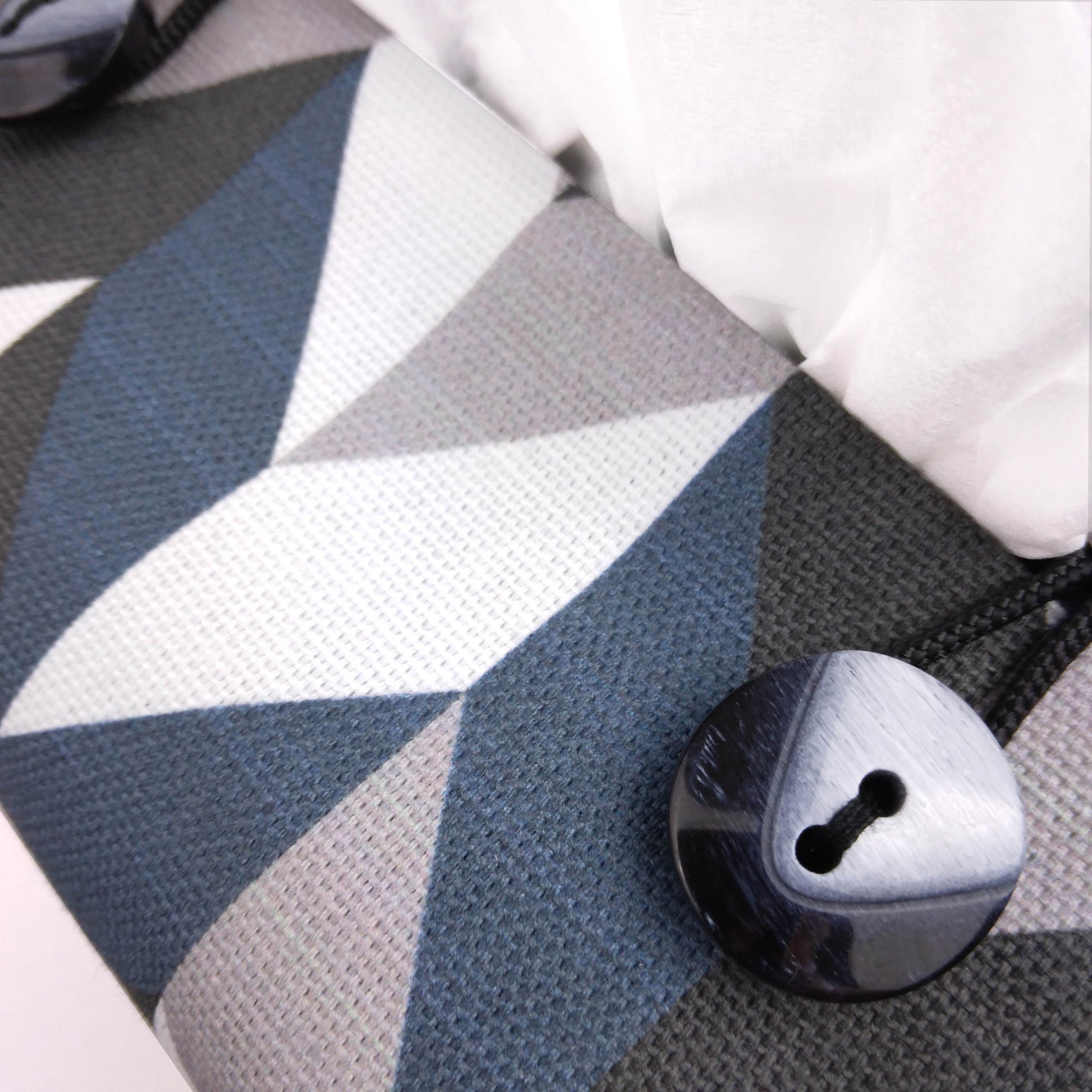 Handcrafted in our Glasgow, Scotland studio, this square tissue box cover features a blue, grey, white, and black herringbone pattern on cotton fabric, along with a black cotton lining. Finished with blue buttons and black nylon cord. The pattern placement varies.