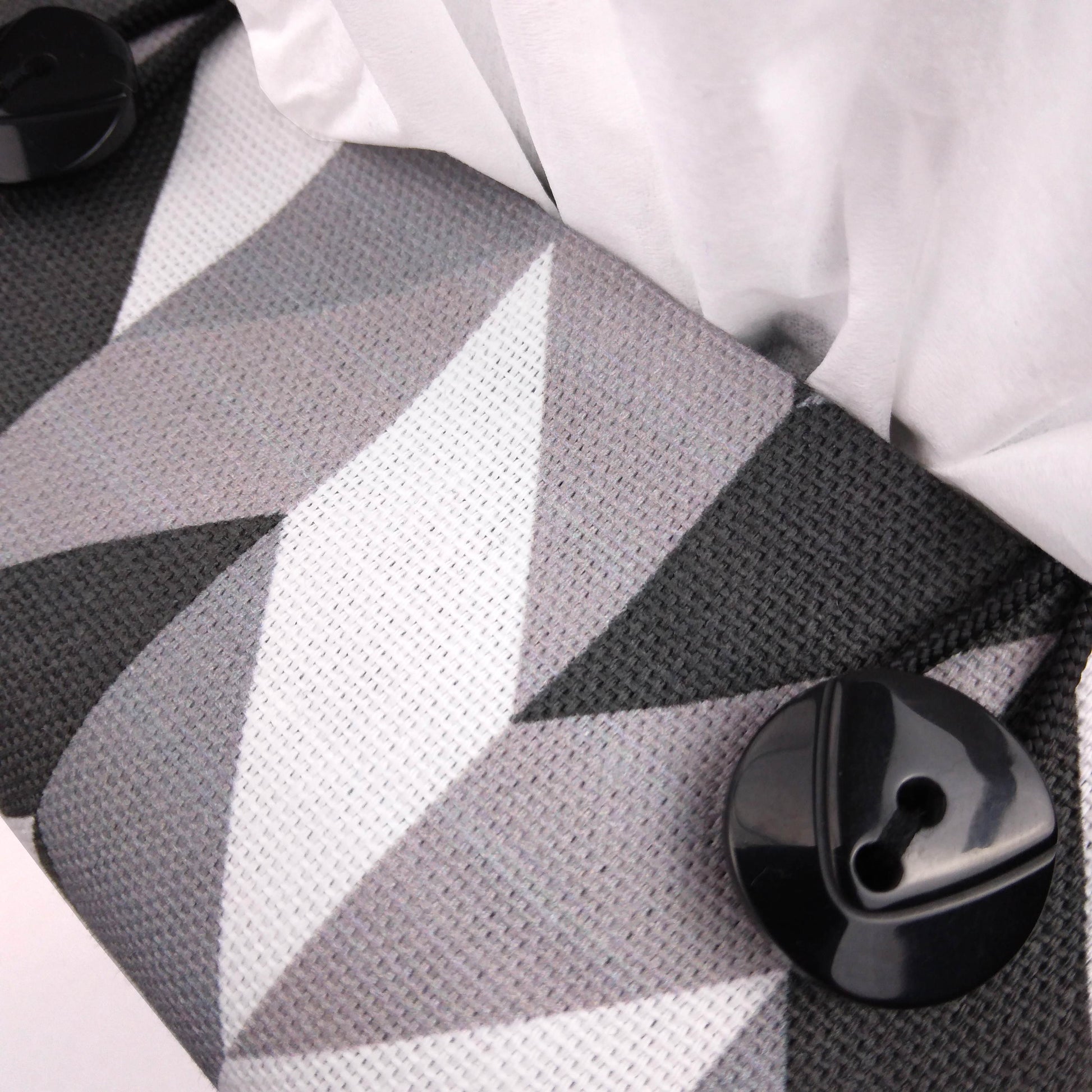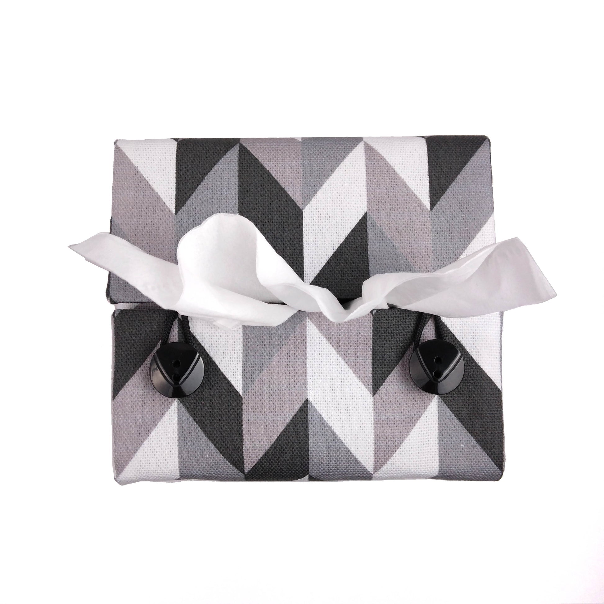 Handcrafted in our Glasgow, Scotland studio, our grey herringbone fabric square tissue box cover is made with cotton and features a black, white, and grey pattern. The lining is made of black cotton, and the cover is completed with black buttons and black cord. Please note that pattern placement varies.