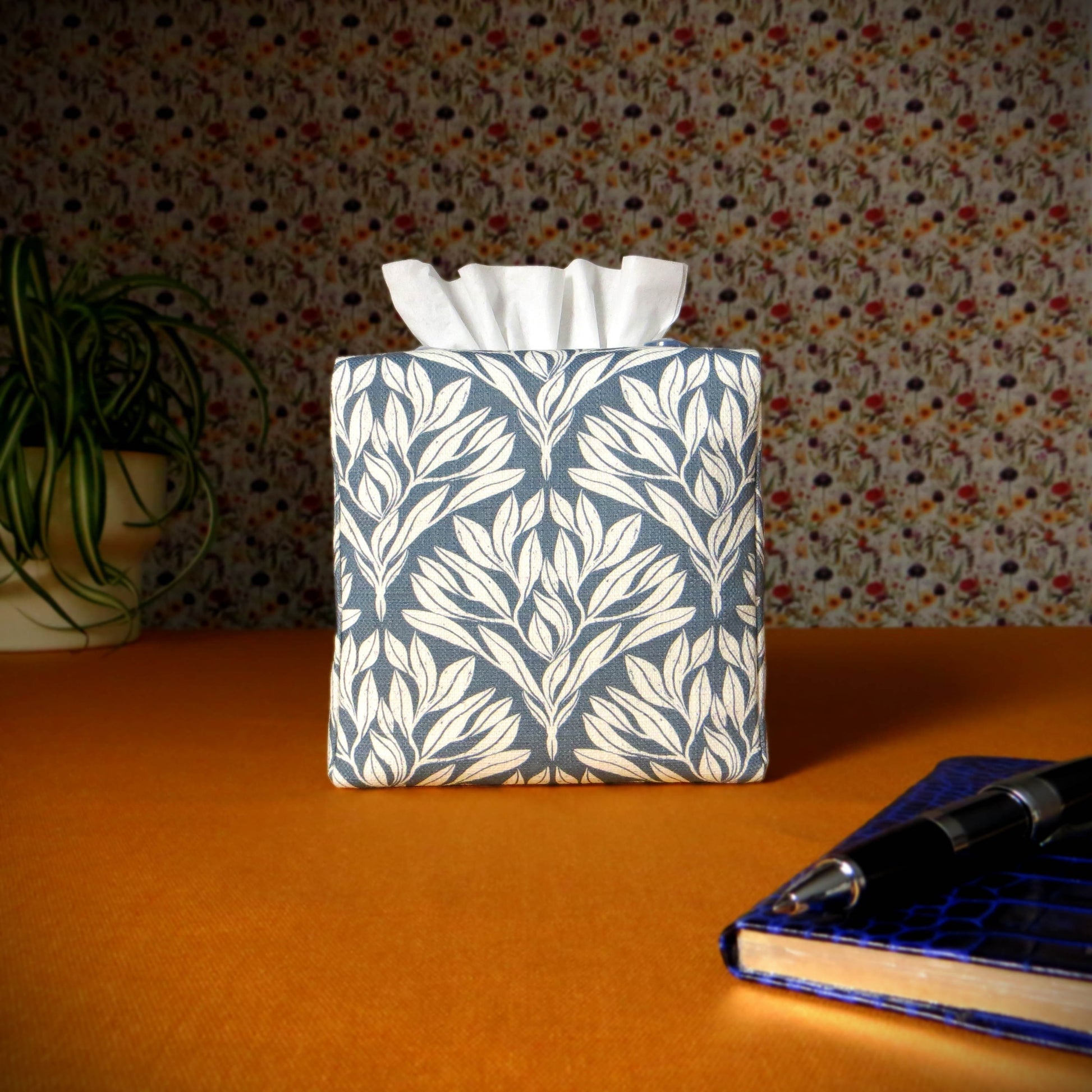 This square tissue box cover is handmade in our Glasgow, Scotland studio from linen fabric with an off-white leaf design on a blue background. It is completed with blue buttons and a white nylon cord for a coordinated finish. Pattern placement varies.