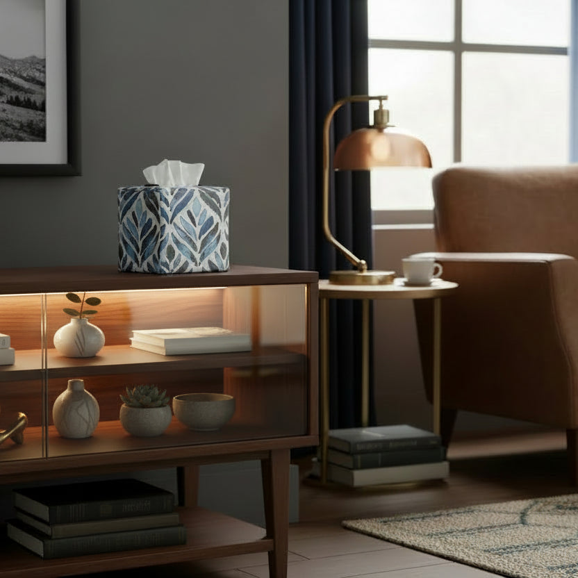 Cube Fabric Tissue Box Cover - Navy Watercolour Leaves