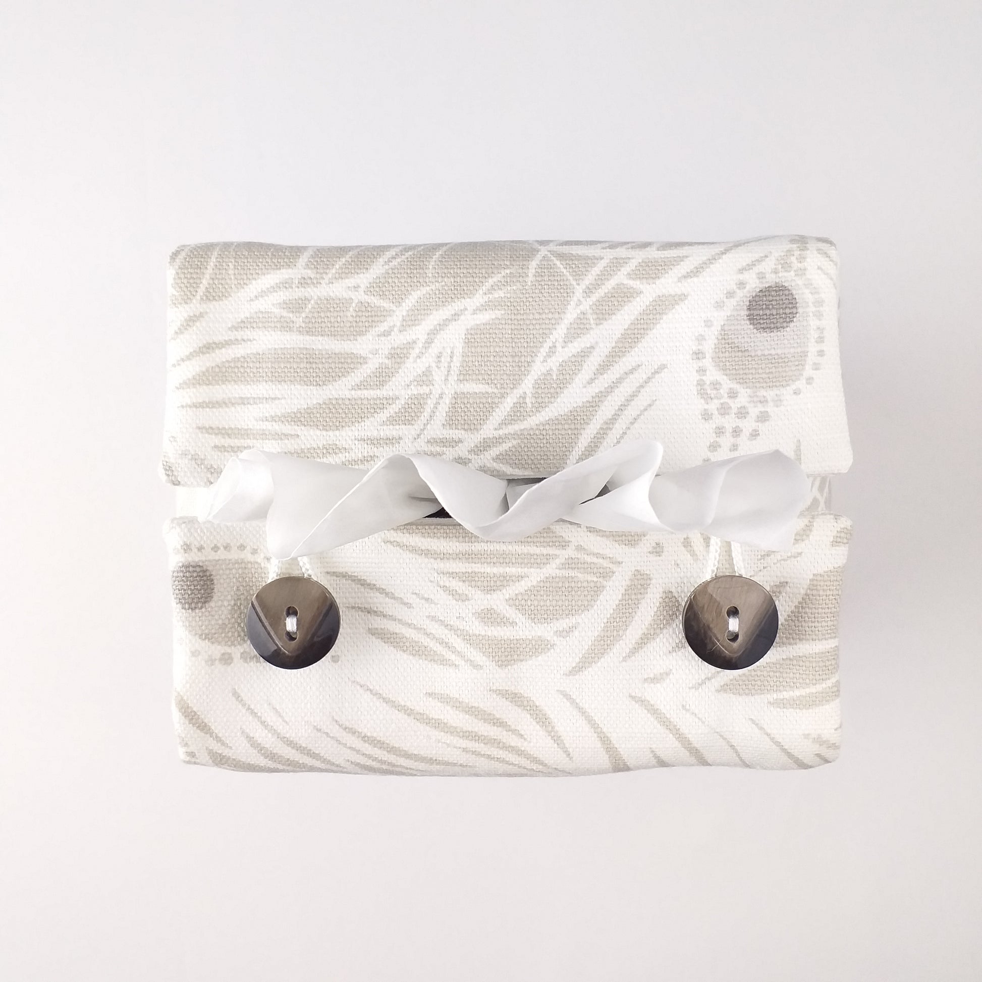 This square tissue box cover is handmade in our Glasgow, Scotland studio. The cotton fabric features a beautiful peacock feathers design on a natural background and is accented with brown buttons and white nylon cord. The placement of the pattern varies.