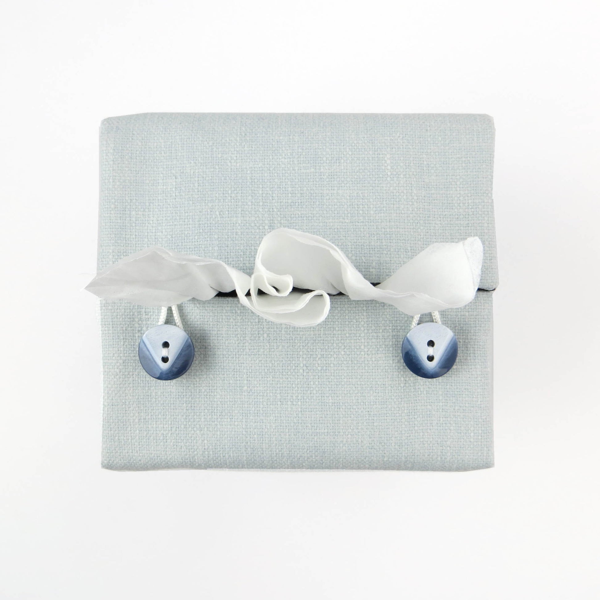 This square tissue box cover is handmade at our studio in Glasgow, Scotland using two cotton fabrics - a light blue top and a dark blue base. The interior features a black cotton lining. Also includes blue buttons with white nylon cord.