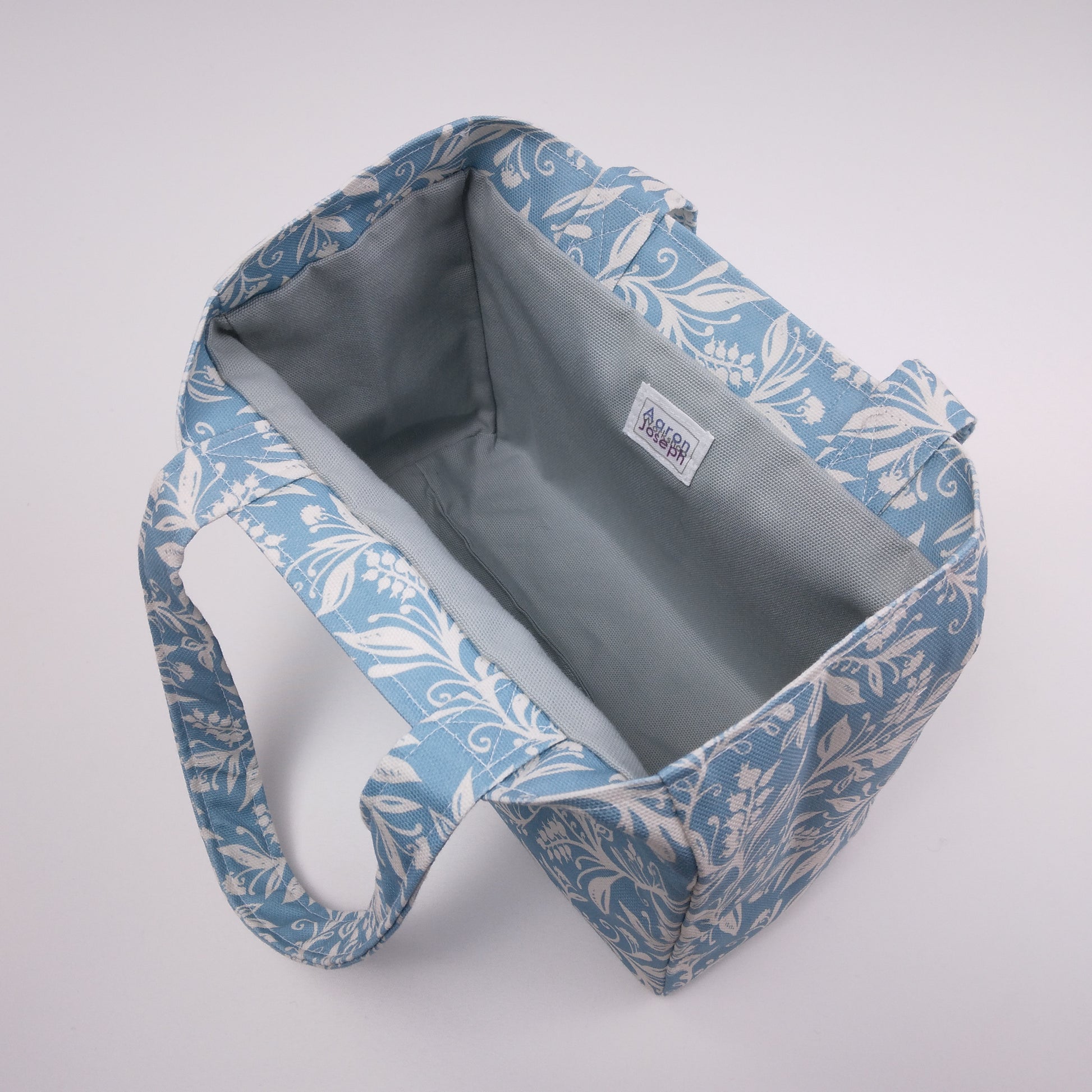This cotton mini tote bag is handmade at our Glasgow, Scotland studio. It features a soft white wildflower silhouette design on a light blue background, with a light grey lining. Please note that pattern placement varies.