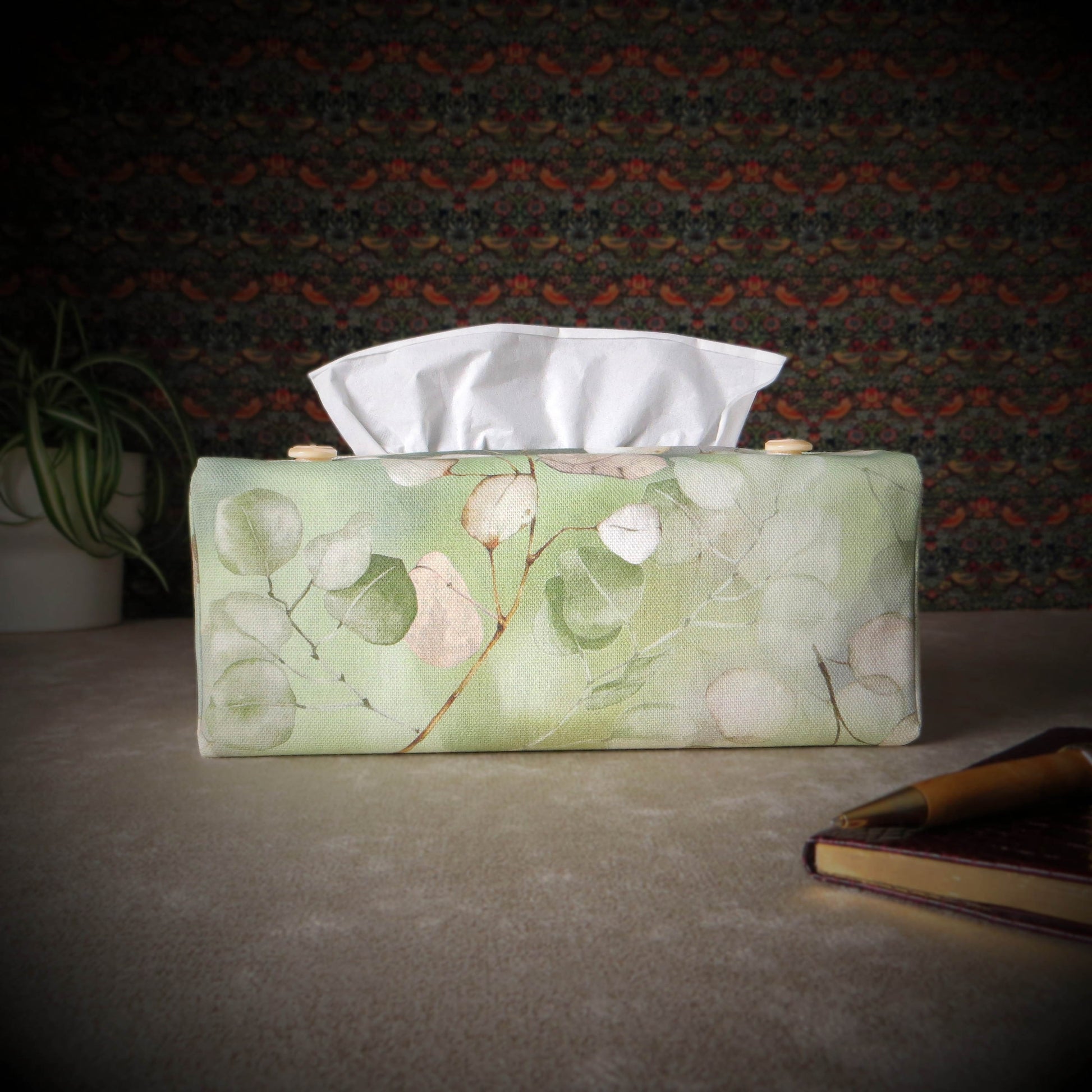 This cotton rectangular tissue box cover is handmade in our Glasgow, Scotland, studio featuring a beautiful Lunaria leaf design on a green background. Each cover is lined with black cotton fabric and finished with cream buttons and white nylon cord.