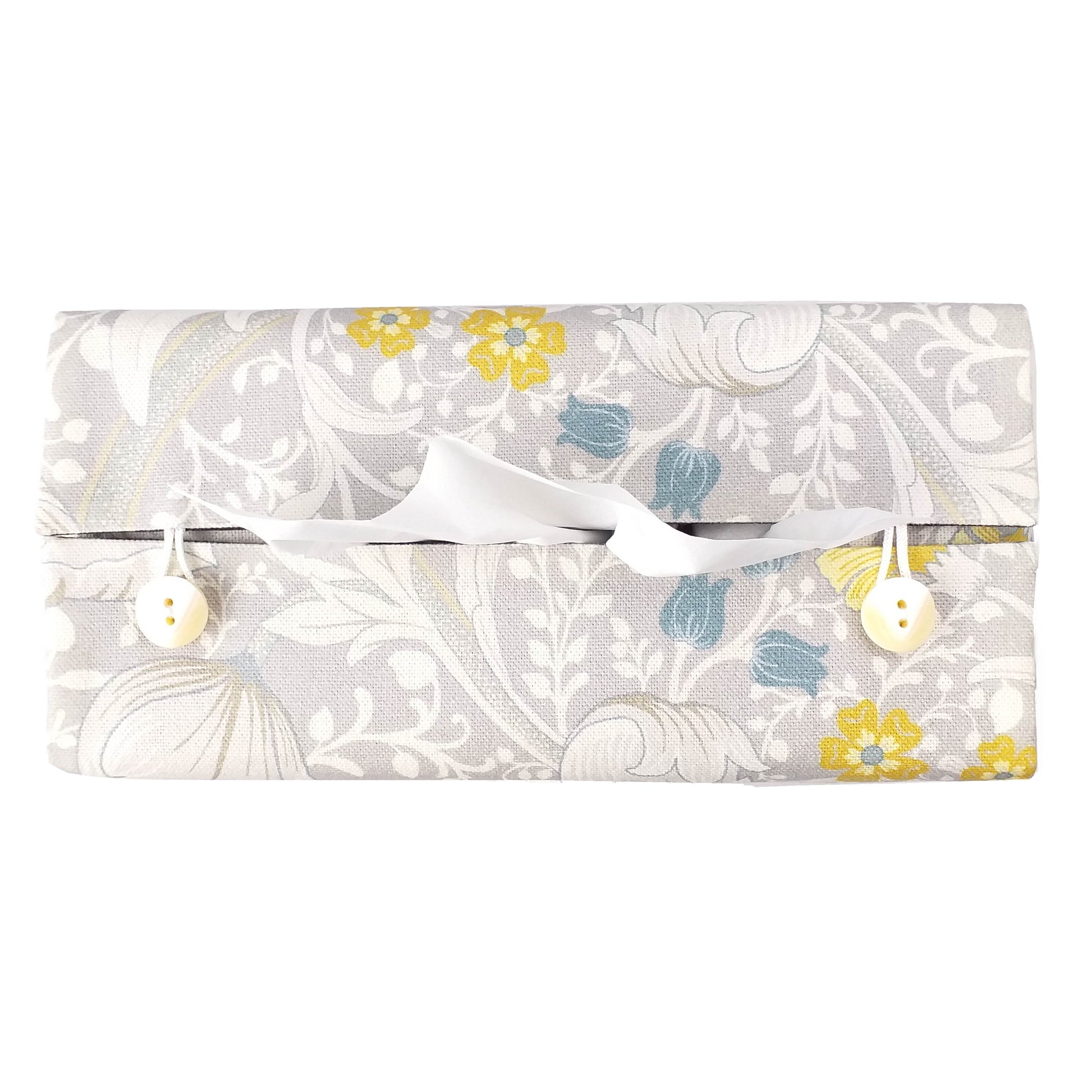 This cotton rectangle tissue box cover is handmade in our Glasgow, Scotland studio and features a beautiful design of white magnolia flowers with blue, yellow, and grey accents. It also includes a black cotton lining, and cream buttons with a white nylon cord. Pattern placement varies.