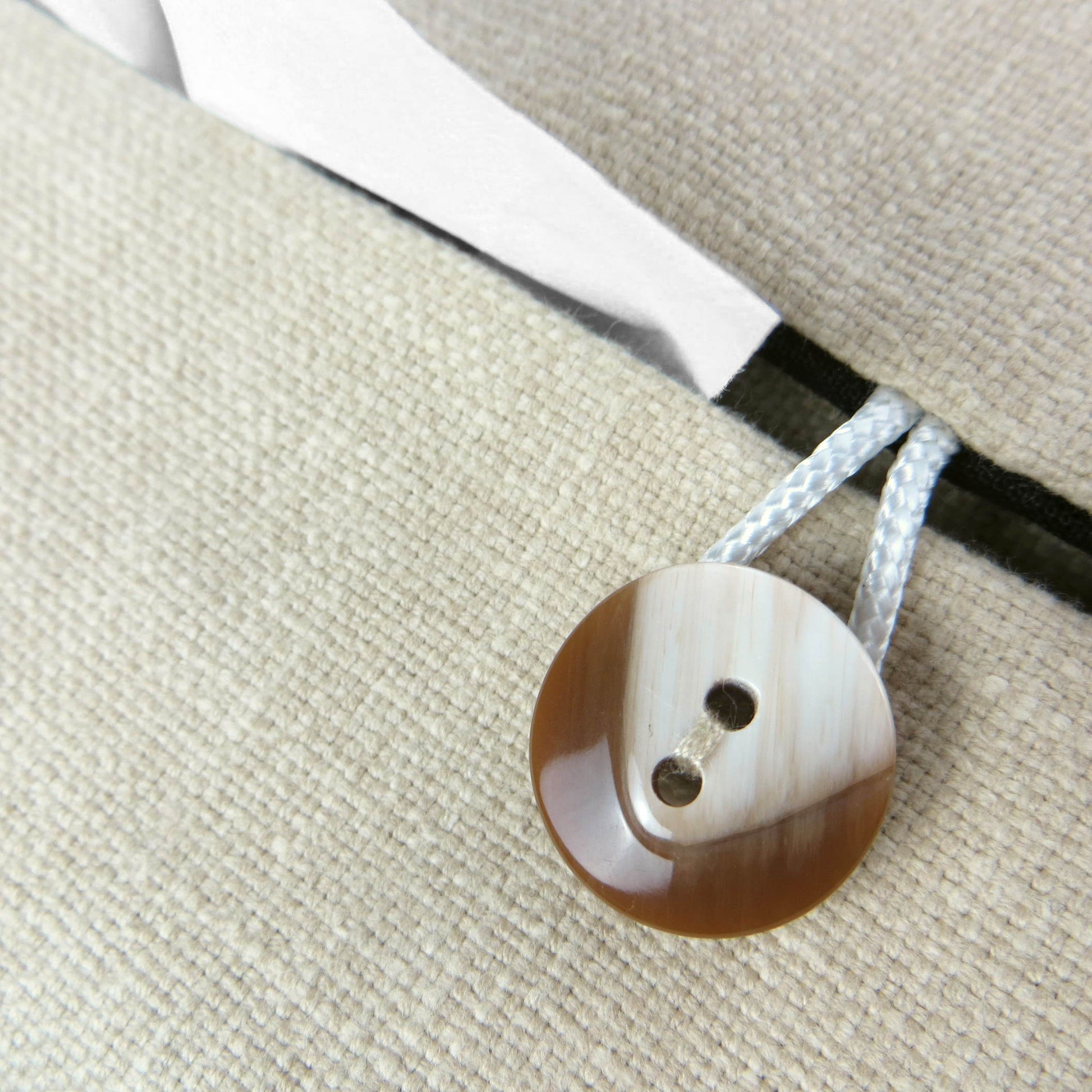 This cotton rectangle tissue box cover features a sand-coloured top and orange base with a black cotton lining. It is finished with brown buttons and white nylon cord. Handmade in our Glasgow, Scotland studio.