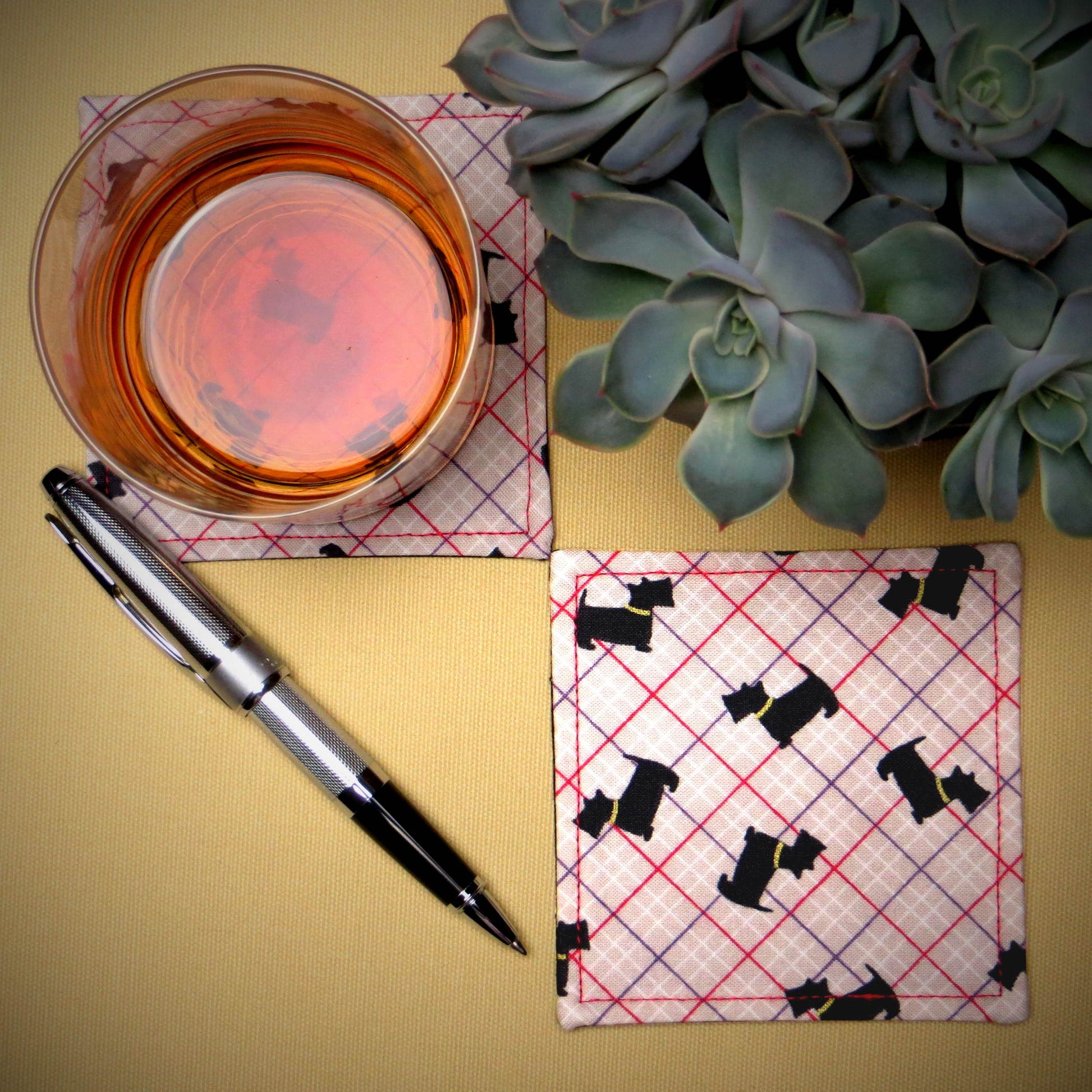 This set includes 2 handmade cotton coasters from our studio in Glasgow, Scotland, each measuring approximately 10cm x 10cm (4" x 4"). They feature a black Scottish Terrier design with a metallic gold collar on an off-white background with a red, purple, and white plaid pattern. The coasters also have 2 layers of interfacing for added stability. Please note that the pattern placement varies.